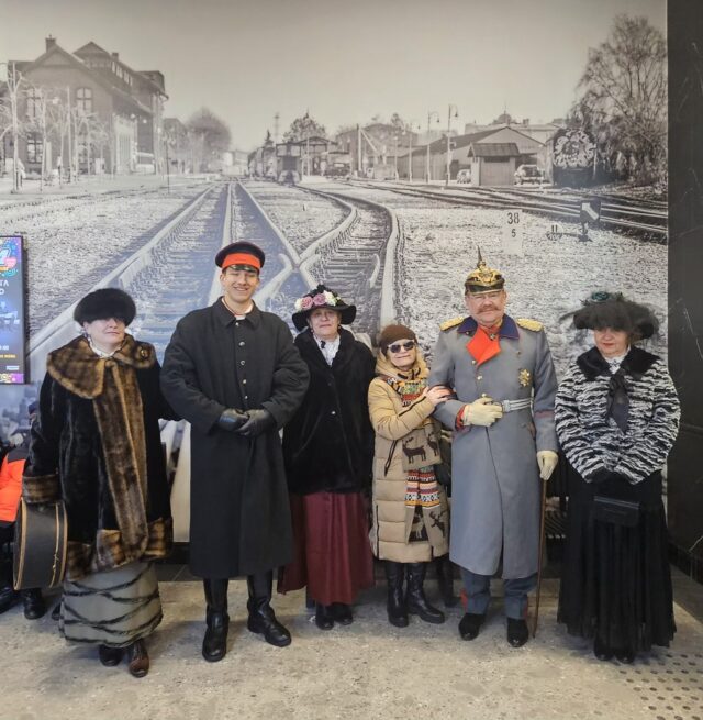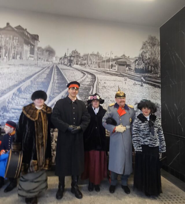 Rekonstruktorzy na dworcu w KowalewiePrzed odnowionym dworcem w KowalewieDzieci z kowalewskiej szkoły na wspólnym zdjęciu z rekonstruktoramiDworzec w Kowalewie i kultowa fotka pleszewskiego toru trójszynowego Ewa Matuszczak, Janek Balcer, Aldona Jańczak, Przemysław Maćkowiak i Małgorzata Walendowska