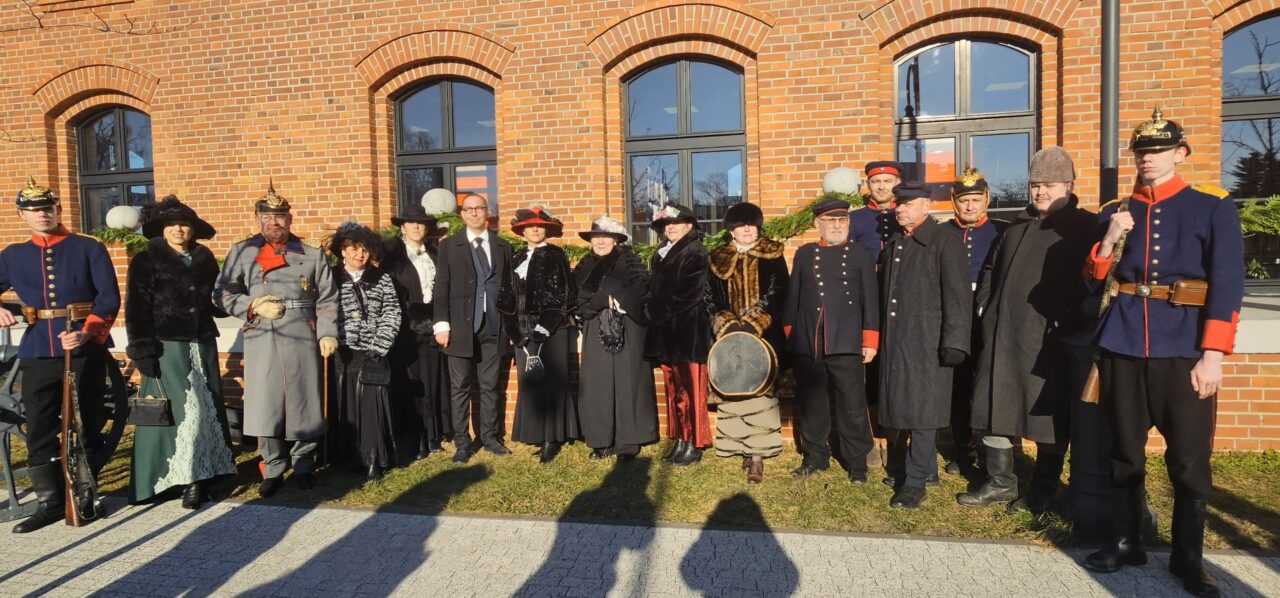 To właśnie historyk, Maciej Kowalczyk stworzył rekonstrukcję wydarzeń z 21 stycznia 1901 roku, kiedy Pleszew był pod zaborem niemieckim a Polski nie było na mapie Europy. Ale w Pleszewie byli ludzie, którym zależało na rozwoju miasta – co podkreślał w historycznym przemówieniu burmistrz Arkadiusz Ptak – to on wcielił się w rolę Paula Beckera – ówczesnego burmistrza Pleszewa. Mówił, że połączenie kolejowe Pleszew zawdzięcza staraniom przedstawicieli trzech nacji, które 125 lat temu Pleszew zamieszkiwały – Polaków, Niemców i Żydów. Byli to projektanci, inżynierowie, budowlańcy, robotnicy… Zaś kolejowe połączenie było ważne dla rozwoju handlu, rolnictwa, edukacji, kultury. Arkadiusz Ptak wystąpił w stroju urzędnika z początku XX w. – miał na sobie czarny płaszcz z kołnierzem futrzanym a na głowie – cylinder.