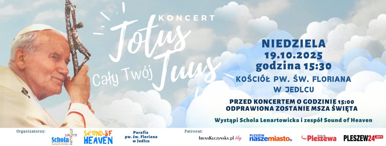 Koncert Totus Tuus odbył się już trzykrotnie w różnych miejscach w Polsce: w Zdunach we współpracy z TV Wielkopolska, w kościele Najśw. Zbawiciela w Pleszewie oraz w Sanktuarium MB w Tursku. W tym roku, na zaproszenie ks. Karola Hojańskiego, koncert odbędzie się w kościele parafialnym pw. Św. Floriana w Jedlcu w niedzielę, 19 października po mszy o godzinie 15:00.