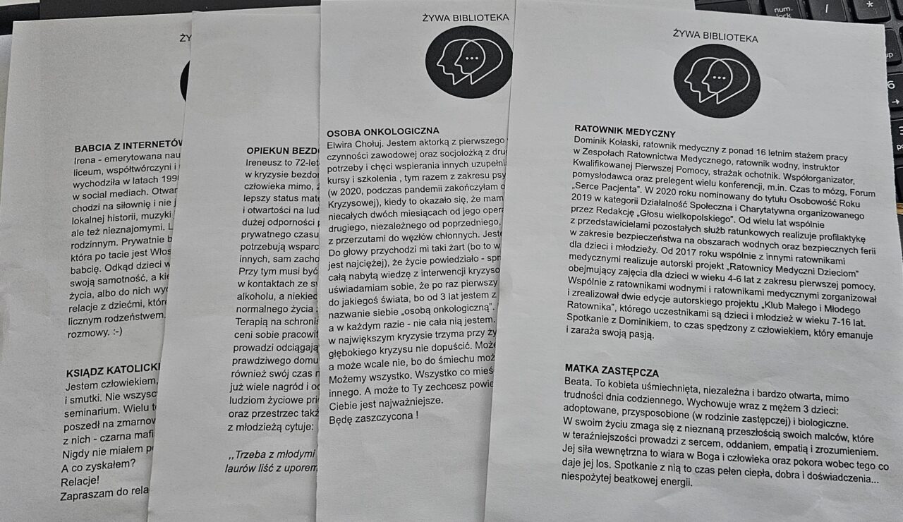 W pleszewskim liceum 120 uczniów wypożyczyło 14 „książek”. Wśród nich znaleźli się m.in. zakonnica, ksiądz, osoba w kryzysie bezdomności, opiekun bezdomnych, amazonka, osoba onkologiczna, wdowa, pielęgniarka, matka zastępcza, trener, ratownik medyczny, wolontariuszka, babcia z internetów, Ukrainka oraz konserwatorka powierzchni płaskich. Rozmowy toczyły się w auli przy stolikach — często bardzo szczere, osobiste i odważne, zarówno ze strony uczniów, jak i gości.