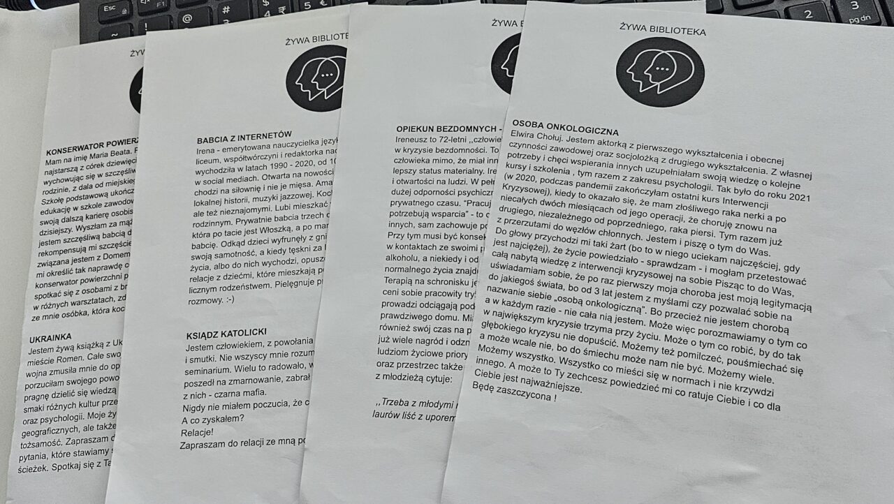 W pleszewskim liceum 120 uczniów wypożyczyło 14 „książek”. Wśród nich znaleźli się m.in. zakonnica, ksiądz, osoba w kryzysie bezdomności, opiekun bezdomnych, amazonka, osoba onkologiczna, wdowa, pielęgniarka, matka zastępcza, trener, ratownik medyczny, wolontariuszka, babcia z internetów, Ukrainka oraz konserwatorka powierzchni płaskich. Rozmowy toczyły się w auli przy stolikach — często bardzo szczere, osobiste i odważne, zarówno ze strony uczniów, jak i gości.