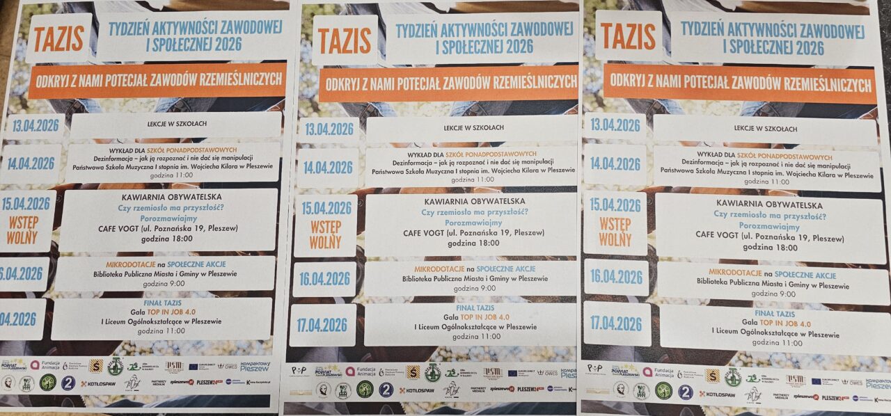 Od poniedziałku do piątku w Pleszewie odbywać się będzie Tydzień Aktywności Zawodowej i Społecznej pod hasłem „Odkryj z nami potencjał zawodów rzemieślniczych”.