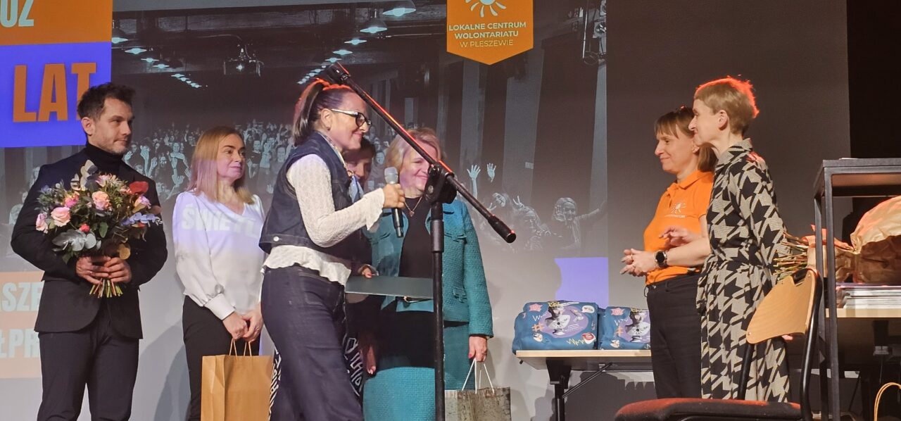 Wśród wspierających wolontariat znalazłam się i ja, co mnie niezmiernie wzruszyło. Wywołana na scenę przypomniałam początki pleszewskiego wolontariatu – kiedy to Lucyna Roszak za swoją działalność otrzymała tytuł Pleszewianina Roku 2011 TUTAJ Kiedy tłumaczyła w Domu Parafialnym, na czym polega wolontariat, nie wszyscy jego ideę rozumieli. Od tego czasu tyle się zmieniło. Na urodzinach świetlicy Lucy przyjmowała gratulacje …