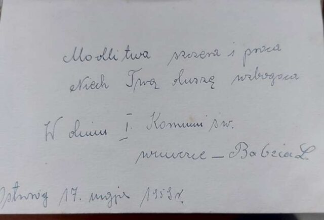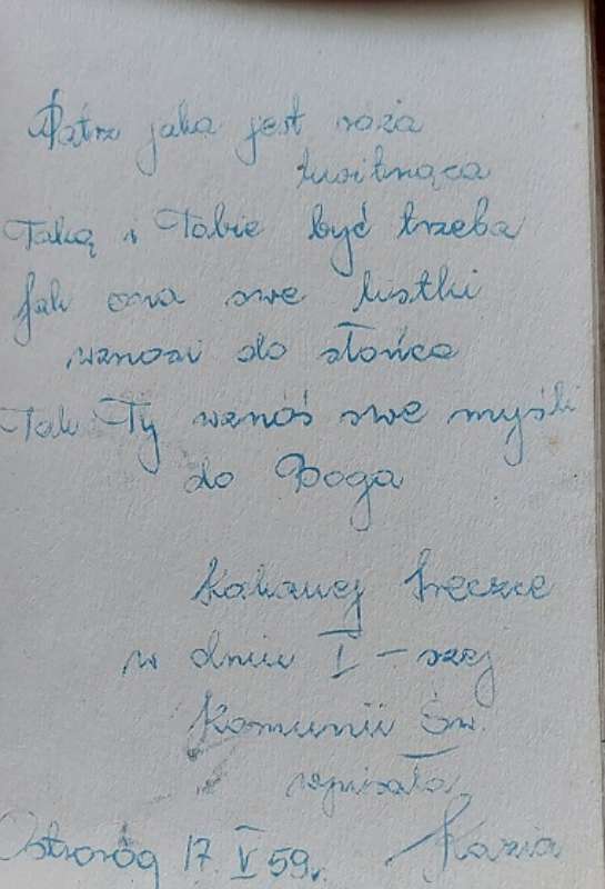Przechowuję  jeszcze jeden pamiętnik – z I Komunii św. z 17 maja 1959 roku; był upominkiem ale natychmiast wykorzystanym – wszyscy goście uczestniczący w przyjęciu pozostawili swoje wpisy. Wielu z nich jest już po drugiej stronie tęczy, ale dzięki pamiętnikowi, mogę ich przywoływać. Ten pamiętnik opisałam już na blogu TUTAJ