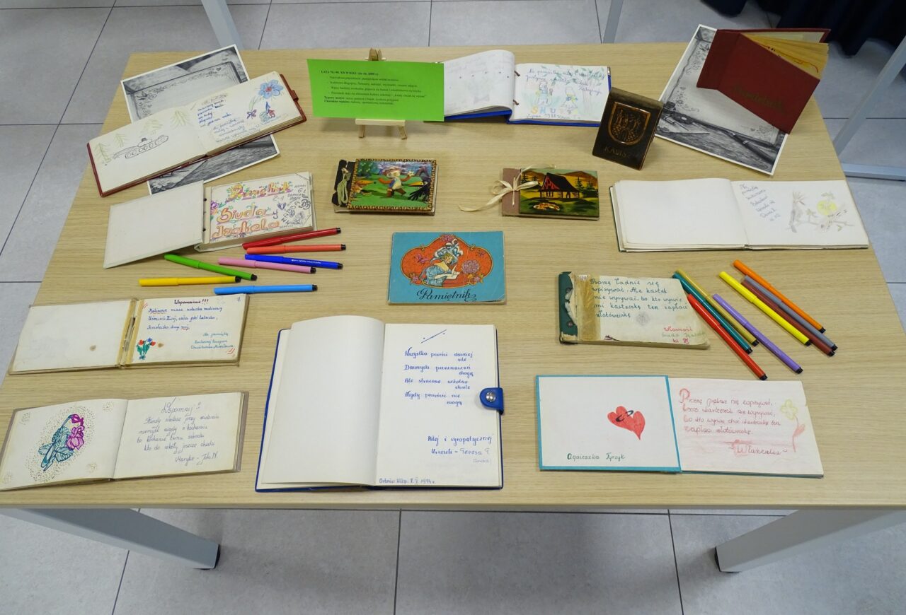 Bo nie tylko pamiętniki dostarczyli czytelnicy ale też kajet z pożegnalnymi wpisami maturzystek z początku lat 50. XX w., zbiory tekstów piosenek wklejanych do zeszytu w czasach przedinternetowych. Jest na wystawce gruby kajet pełen wzorów haftów. Są zdjęcia tzw. wykazowe czyli legitymacyjne, które darowano koleżankom przy rozstaniu na okoliczność ukończenia szkoły. Na odwrotach fotek są dedykacje. Pani Marianna mówiła też o tym, jak się pamiętniki zmieniają – te najmłodsze mają wpisy kolorowymi mazakami…