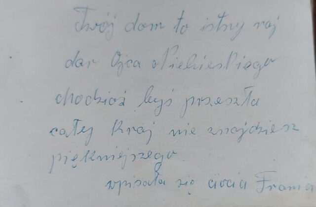 Na ekspozycji są trzy moje pamiętniki – jeden z 1959 roku – prowadzony do 1965 (wtedy powstał ostatni wpis) pełen wspomnień. Kiedy biorę go w ręce wspominam autorów wpisów – mamę, babcię, siostrę, brata, nauczycielki, nauczycieli, koleżanki ze szkoły podstawowej a potem też z liceum w Szamotułach. Kiedy czytam wpisy przywołuję tych, którzy zapiski pozostawili. Każdą i każdego pamiętam i wspominam z rozrzewnieniem. Pamiętam wierszyk katechetki pani Zosi Lembiczowej: „Uśmiech to promień z nieba zesłany, który rozprasza smutki, ciemności, więc się uśmiechnij dziecię kochane a w wielu sercach radość zagości”. Przy okazji pobytu na rodzinnym cmentarzu w Ostrorogu, mijając grób pani Zosi, ślę uśmiech.