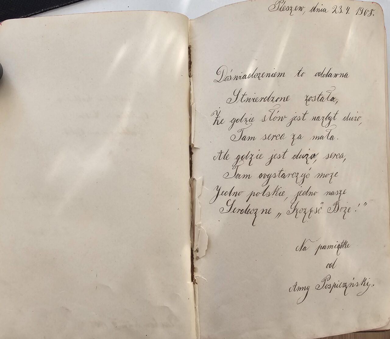 Najstarsze pamiętniki przyjechały z Pleszewa, o tym z roku 1918, opowiedziała w swoim wystąpieniu Agnieszka Słupianek – Winkowska. Pamiętnik z roku 1906 (data pierwszego wpisu) znajduje się w zbiorach pleszewskiego kolekcjonera Walentego Jezierskiego, który go wypożyczył tylko na czwartkowe spotkanie. Ale każdy mógł go sobie wziąć do rąk i obejrzeć. A jest ciekawy, bo prowadzony w dwóch językach – polskim i niemieckim – był to czas kiedy Pleszew leżał w prowincji Poznań, która była częścią Królestwa Prus wchodzącego w skład Cesarstwa Niemieckiego (Deutsches Reich). Zamieszkiwali miasto Polacy ale też Niemcy. W szkole obowiązywał język niemiecki.